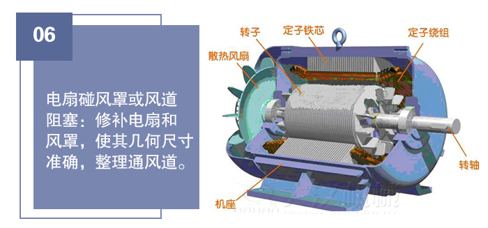 9、電扇碰風(fēng)罩或風(fēng)道阻塞:修補(bǔ)電扇和風(fēng)罩,使其幾何尺寸準(zhǔn)確,整理通風(fēng)道。