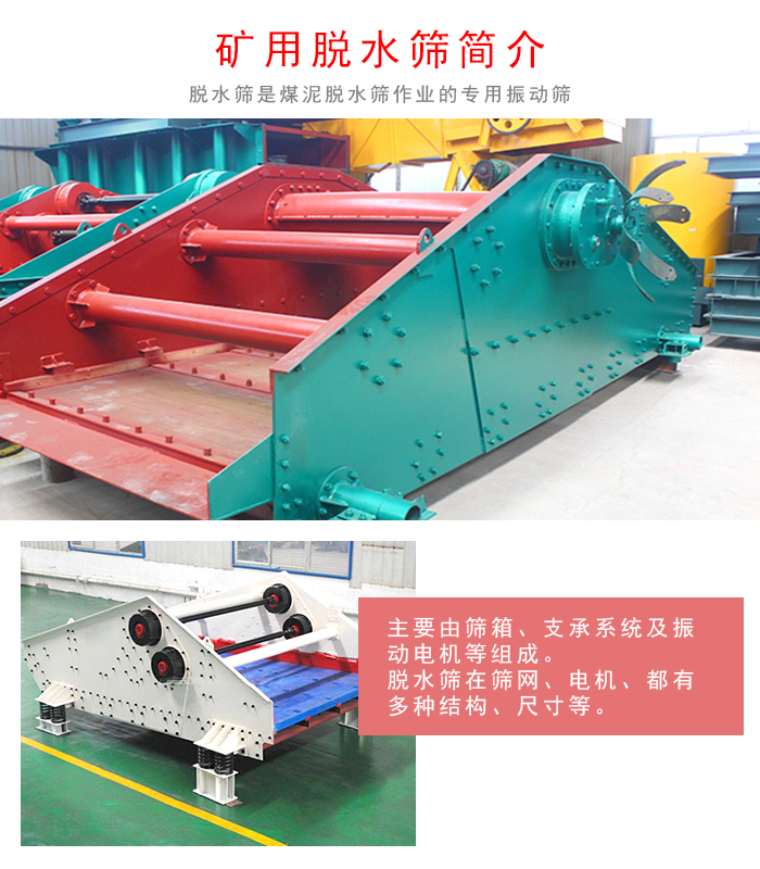 礦用脫水篩是煤泥脫水作業(yè)的專用振動篩,它廣泛適用于選煤、電力、選礦、制鹽、化工、制糖等行業(yè)中的細粒度干式、濕式篩分煤泥回收,過濾隔粗、壓濾隔粗、其他極細物料的脫水、過濾隔粗脫水、脫介、脫泥回收等工藝中。