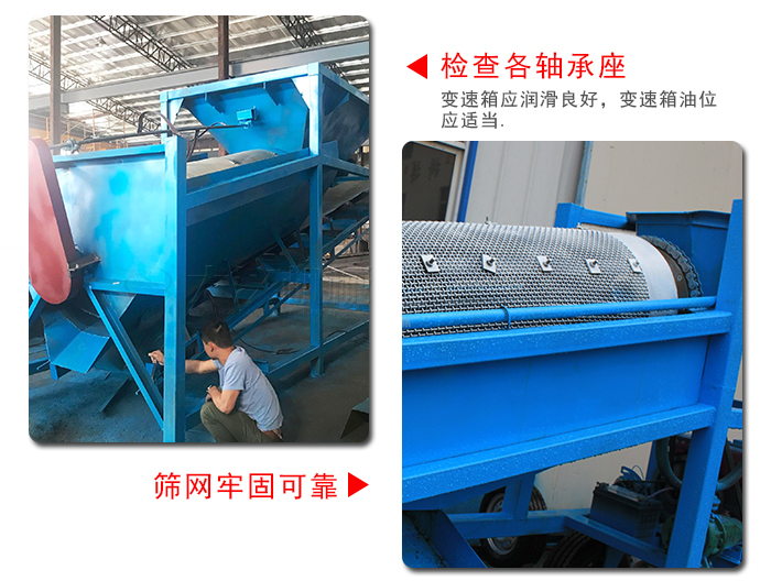 一、篩沙機調(diào)試、篩沙機各部件安裝完,檢查合格后,可進行試運轉(zhuǎn)。試運轉(zhuǎn)前,應詳細檢查各部件按圖紙所示安裝正確,各緊固件牢靠,篩體周圍是否有妨礙滾筒篩篩沙機運行的障礙物;