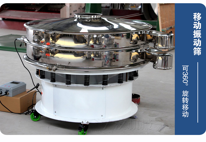 該設(shè)備底部加裝萬(wàn)向旋轉(zhuǎn)輪,可360°旋轉(zhuǎn)移動(dòng),所以稱之為:移動(dòng)振動(dòng)篩