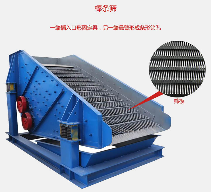 棒條篩篩面是由一組相互平行的彈簧棒條和安裝棒條的固定梁等組成的,鋼棒采用65Mn,55CrSi,60SiMn等彈簧鋼,一段插入口形固定梁,另一端懸臂形成條形篩孔,棒條的長度設(shè)計在220-360mm之間。該設(shè)備主要適用于破碎機(jī)前大塊物料的均勻給料,以及垃圾的篩分處理等行業(yè)中。