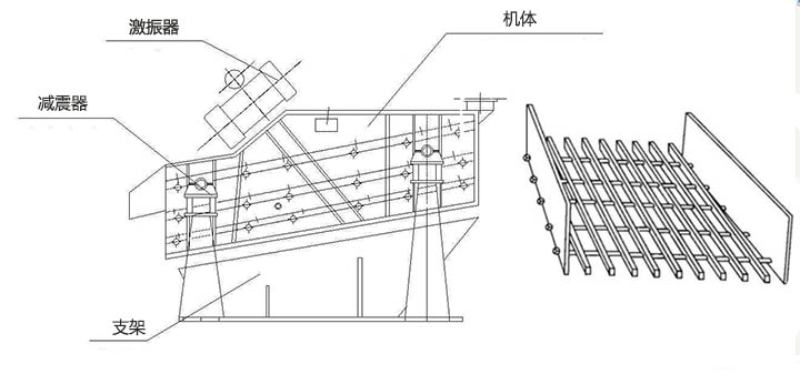 棒條篩工作時,由激振器產(chǎn)生的激振力通過篩箱傳遞給篩箱內(nèi)的篩面上,因激振器產(chǎn)生激振動力為縱向力,迫使篩箱帶動篩網(wǎng)面作縱向前后位移。在一定條件下,篩網(wǎng)面上的物料因受激振力作用而被向前拋起,落下時小于篩孔的物料則透篩而落到下層,物料在篩網(wǎng)面上的運(yùn)動軌跡為拋物運(yùn)動,由于這樣周而復(fù)始的物料運(yùn)動,從而完成物料篩分作業(yè)。