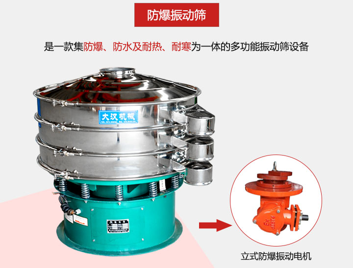 防爆振動篩是針對一些易產(chǎn)生爆炸行業(yè)的研發(fā)設(shè)計而成,是一款集防爆、防水及耐熱、耐寒特殊要求的場合為一體的多功能振動篩設(shè)備,能夠?qū)崿F(xiàn)該功能主要原因是防爆振動篩采用的是立式防爆振動電機(jī)。