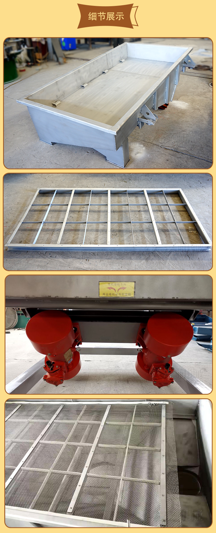 5、電機(jī)臺座:安裝振動電機(jī),使用前連接螺釘必須擰緊,特別是新篩機(jī)試用前三天、必須反復(fù)緊固,以免松動造成事故。